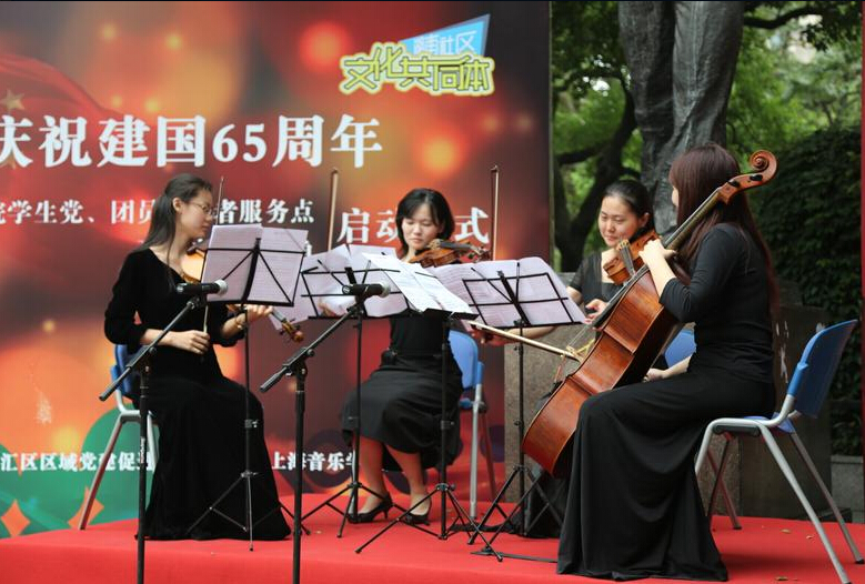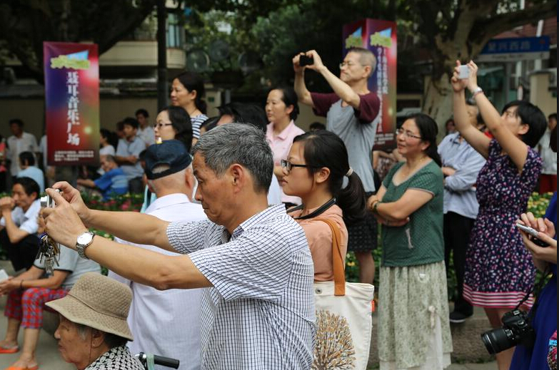 在徐汇区委常委、宣传部长吕晓慧及米兰·体育网页版入口党委副书记、纪委书记刘艳共同为聂耳音乐广场项目揭牌之后,以研究生党员为主的我院学生志愿者带来了一场高质量的小型音乐会。音乐会形式多样,内容丰富,有四重唱、手风琴二重奏、萨克斯四重奏、男女生对唱、弦乐四重奏等等,吸引了众多市民驻足聆听,他们中有推着轮椅上的老伴一同在散步的老人,有拎着东西路过的行者,还有在路边清扫的环卫工人,他们或坐着、或站着簇在花坛边凝神倾听,或许是因为这种专业音乐演出第一次来到他们身边。音乐会结束后,大家久久不能散去,都期待着今后每月最后一个周五午间的再次相会。