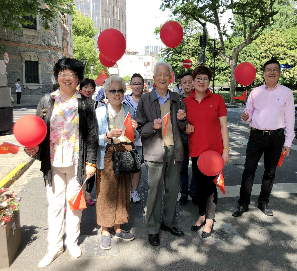 我院离退休教职工代表沙汉昆、吴琰若、鲍民先、苏允申、潘汉英、邵志瑞、刘东、杨志伟挥舞着手中国旗与党旗加入演唱,其中离休老干部沙汉昆是90多岁高龄的老教师。