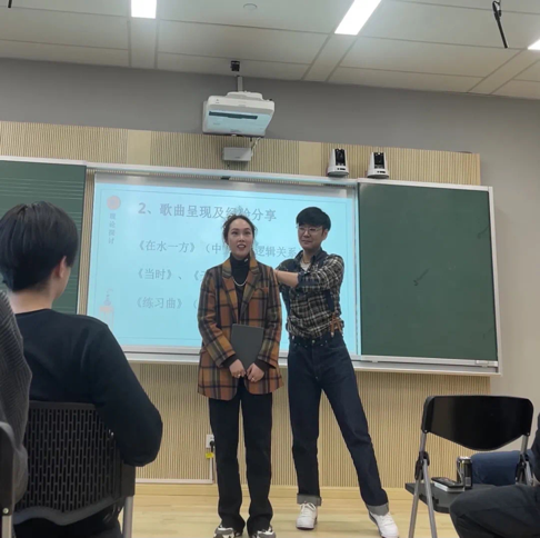讲座第二部分“实践分享”中,四位同学先后上台演唱了《在水一方》《当时》《天边外》和《练习曲》四首歌曲,并由袁老师指点。
