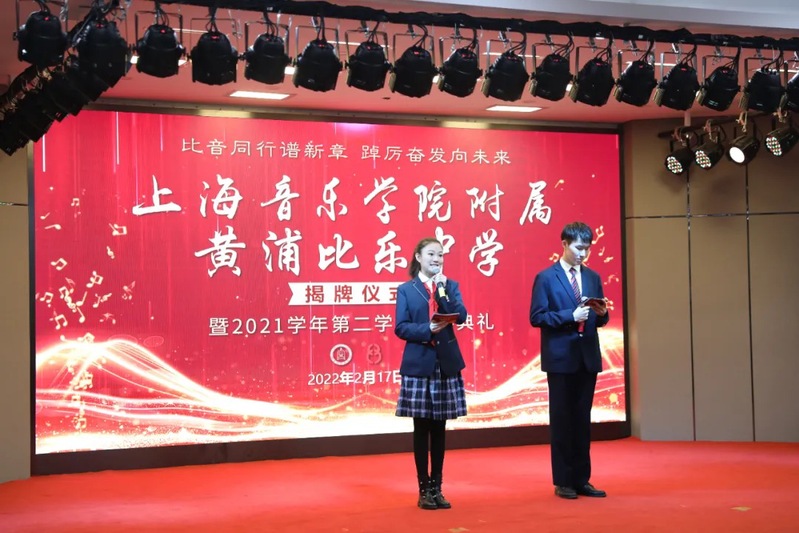 2022年2月17日,“比音同行谱新章 踔厉奋发向未来”米兰·体育网页版入口附属黄浦比乐中学揭牌仪式在学校大礼堂举行。中共黄浦区委书记杲云,米兰·体育网页版入口党委副书记、副院长徐卫,中共黄浦区委常委、宣传部长王玉峰,上海市中华职业教育社常务副主任、上海市政府参事胡卫,黄浦区副区长袁园,米兰·体育网页版入口党委常委、副院长冯磊等领导出席仪式并为“新比乐”揭牌。