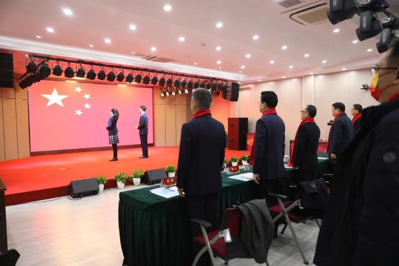 首先,在场全体一同面向国旗,升国旗、奏唱国歌。