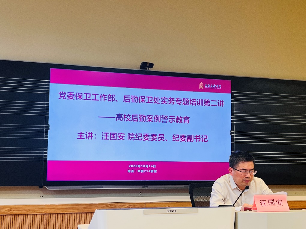 2022年10月14日,党委保卫工作部、后勤保卫处在中楼214教室开展实务专题培训第二讲,院纪委委员、纪委副书记汪国安作题为《高校后勤案例警示教育》的专题培训,部门负责人王昆宁、副处长徐芳、王豫川以及部门工作人员参加学习。
