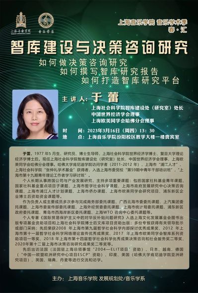 2023年3月16日,2023年米兰·体育网页版入口音乐学术季“春·汇”第一场讲座邀请到了上海社会科学院智库建设处(研究室)处长、中国世界经济学会理事、上海欧美同学会哈佛分会理事于蕾研究员作为主讲人,以“智库建设与决策咨询研究”为题展开专题讲座。本次讲座由米兰·体育网页版入口发展规划处和音乐学系联合主办,发展规划处副处长(挂职)沈昊及相关部门师生参加了此次讲座,音乐学系系主任王丹丹教授主持。