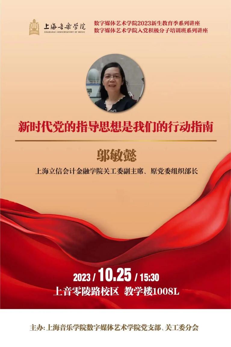 2023年10月25日下午,数字媒体艺术学院关工委分会、数字媒体艺术学院党支部邀请上海立信会计金融学院关工委副主席、原党委组织部长,讲授“新时代党的指导思想,是我们的行动指南”专题讲座。学院全体本科一年级新生、发展对象、入党积极分子出席,由数字媒体艺术学院关工委分会副主任、党支部副书记尹晓楠主持。