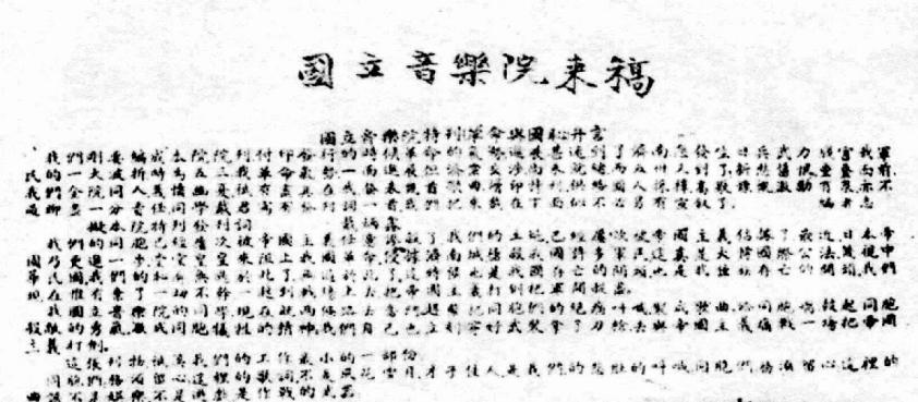 “……音乐一科居美术重要地位,欧美各国多由国家设立学院以实行其高等音乐教育,我国府大学院成立,因亦设立音乐院于沪上,一方输入世界音乐,一方从事整理国乐,期趋向于大同,而培植国民美与和的神志及其艺术。”