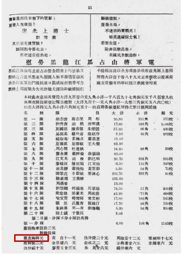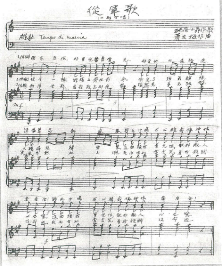 “九一八”事变发生后的五天,国立音专师生在学校礼堂正式成立“国立音专抗日救国会”,通过组织大纲及宣言、代电,并选出干事会和交际代表。萧友梅谱写了《从军歌》,支持音专师生成立“抗日会”,并为东北义勇军募捐演出,带领音专师生积极践行爱国理想,将自己所从事的教育事业与国家、民族的生死存亡紧密联系一起,体现出强烈的社会责任感与忧患意识。