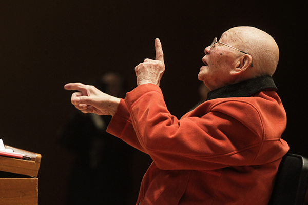这个点子,是马革顺在演出前几小时提出的,他要让观众通过看排练更好地理解合唱。平时走路要人搀扶的马革顺,此刻在台上精神矍铄、活力四射。排练完毕,合唱团又一气呵成地演唱了一遍,台下掌声雷动。