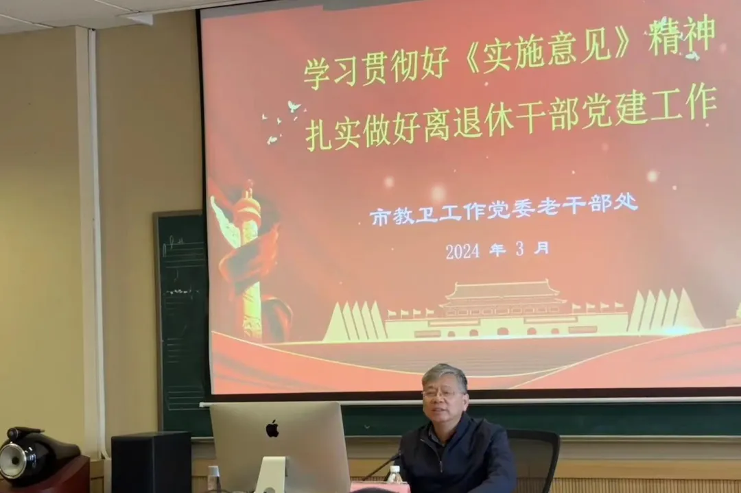 为贯彻落实《实施意见》精神,培训邀请市教卫工作党委老干部处处长、二级巡视员金勤明以“学习贯彻好《实施意见》精神、扎实做好离退休干部党建工作”为主题,为老同志作专题报告。他从《实施意见》的重要意义、鲜明特点、核心要义等多方面为大家进行了详细解读,着重讲解如何准确理解和把握《实施意见》的6个方面18项重点工作内容,带领大家深刻领会文件精神实质。他还结合教卫工作党委系统离退休干部党建工作实际,强调了在贯彻落实中需要把握好三个问题,并要求做好2024年度离退休支部党建工作。