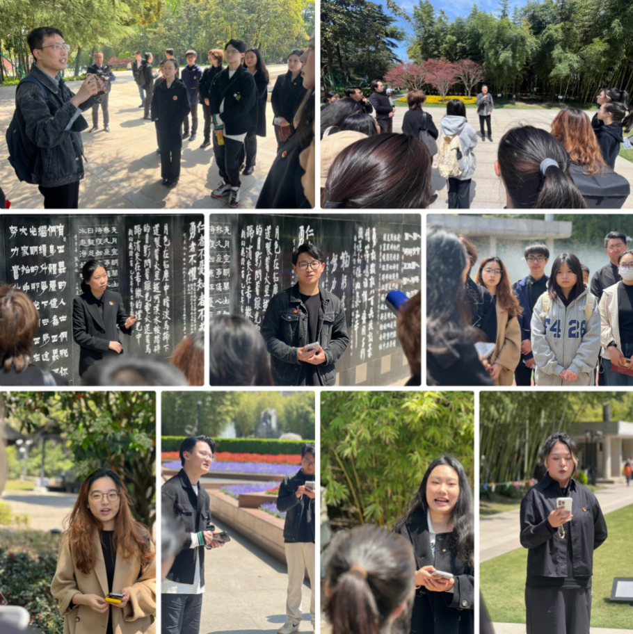 专题研讨会后,大家前往陵园烈士墓区、无名烈士雕像前、碑林区、就义区等地,开展 “行走的思政课堂”。同学们围绕瞿秋白、贺绿汀、陈延年、陈乔年、恽代英、欧阳立安等人物事迹作微课宣讲。