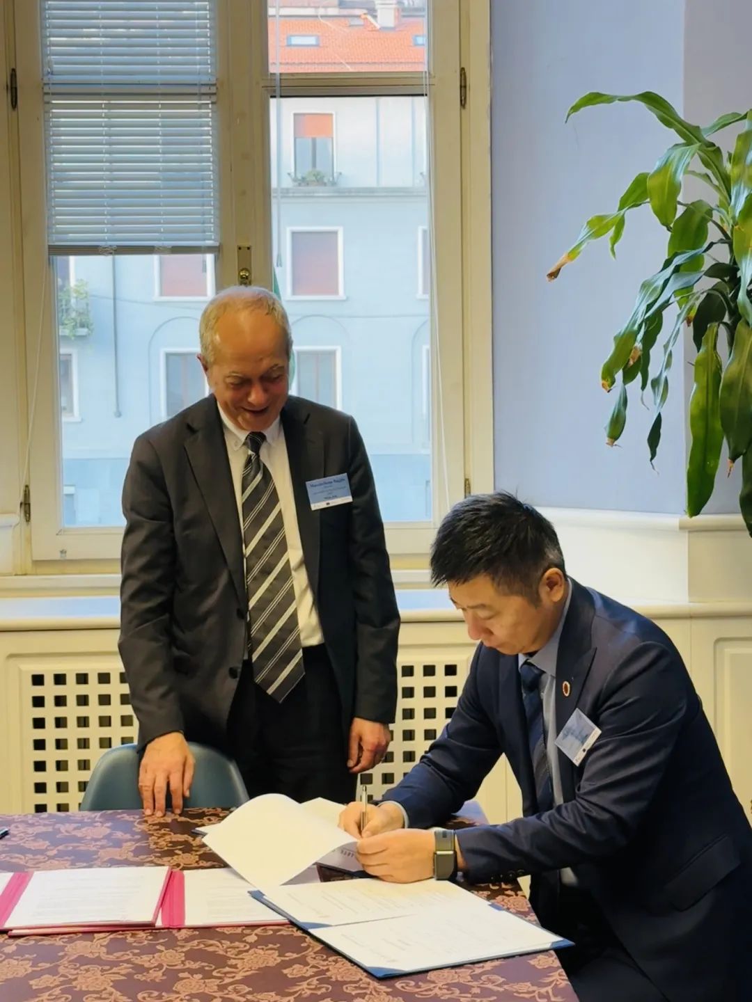 在米兰威尔第音乐学院期间,米兰官网首页登录入口代表团受邀与米兰音乐学院院长马西米利亚诺·巴乔(Massimiliano Baggio)等会见。冯磊介绍了米兰官网首页登录入口建校历史、学科特色,以及近年“一厅一院”和演出季建设情况。巴乔对米兰官网首页登录入口近年发展成就表达赞赏,并期待未来在学科建设、人才培养、学术研究、米兰体育部等多领域开展合作。最后,双方代表正式签署合作协议。