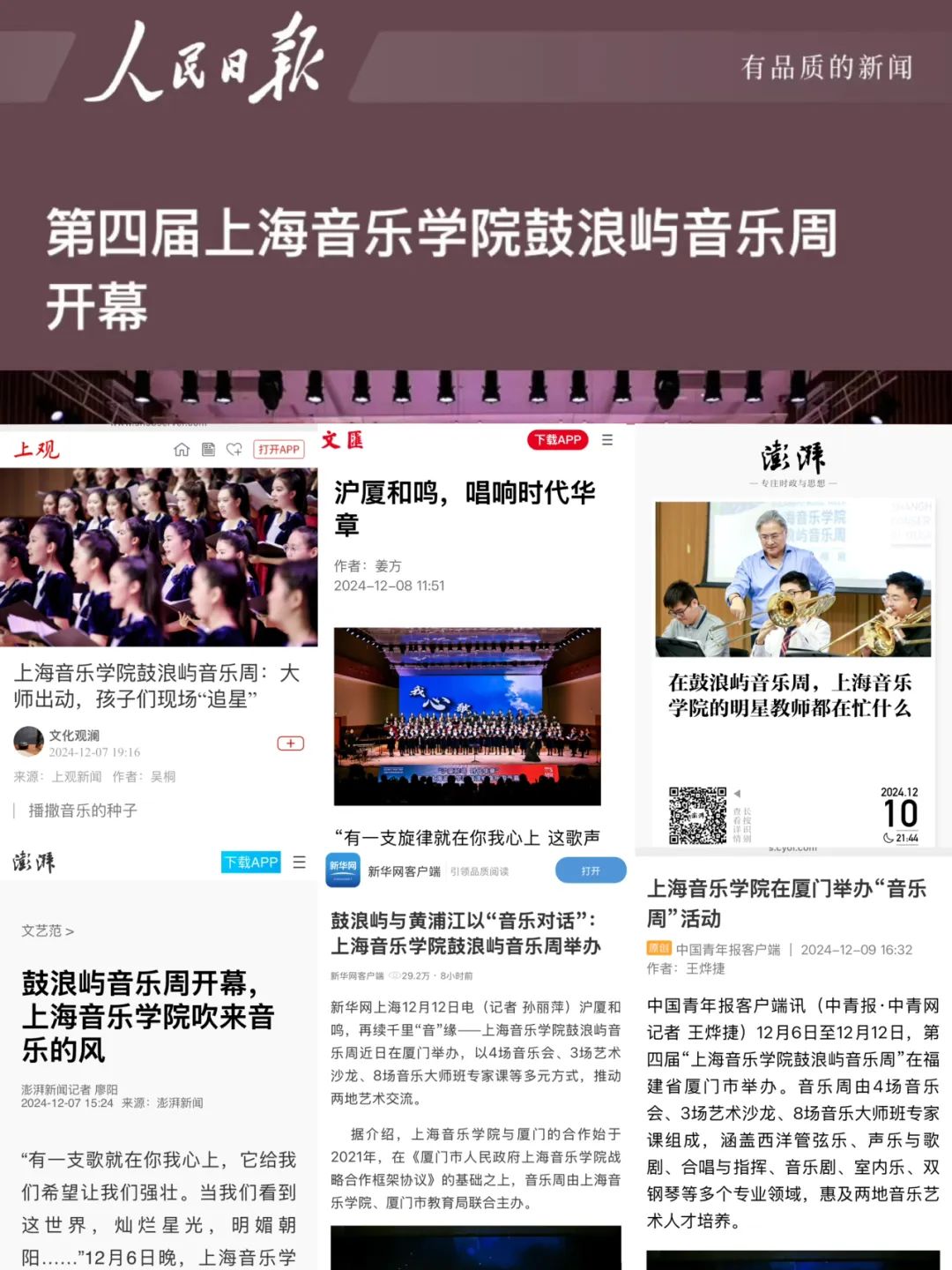 音乐周圆满落幕,音乐声反而更加嘹亮。包括《人民日报》、新华网、《中国青年报》、上观、《文汇报》、澎湃新闻在内,全国各地媒体纷纷以“沪厦和鸣,唱响时代华章”“大师出动,孩子们现场追星”“鼓浪屿音乐周开幕,米兰·体育网页版入口吹来音乐的风”等为题,对米兰·体育网页版入口鼓浪屿音乐周进行专注报道。余音绕梁,不止三日。音乐和音乐带来的美育会渗透进我们的生活里,“让音乐属于每一个人。”