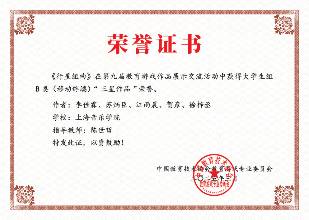 近日,第九届全国教育游戏作品展示交流活动圆满落幕。音乐工程系由李佳霖(音科研一)、苏炳臣(音科研二)、江雨晨(音科研二)、贺彦(音科大一)、徐梓丞(音科大二)组成的“音墨科韵”团队(指导老师:陈世哲)的VR作品《行星组曲》,荣获大学生组B类(移动终端)“三星作品”荣誉。