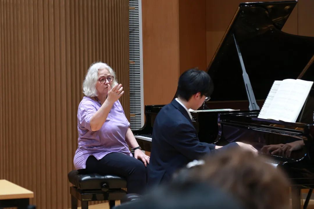 在大师课上,波布洛斯卡教授特别强调“忠于原谱”的重要性。她指出,乐谱是作曲家意图的直接体现,演奏者必须尊重并深入理解其中的每一个标记。除了对乐谱的精准诠释,教授还特别强调了声音质量的重要性。她指出,演奏者需要学会“听”——不仅要听见声音的质感和层次,还要敏锐地捕捉到每一个音符的细微变化。她建议选手们在演奏时保持开放且专注的听觉,提醒演奏者根据场地大小和钢琴特性灵活调整声音效果,确保声音能够清晰、准确地传达给听众。