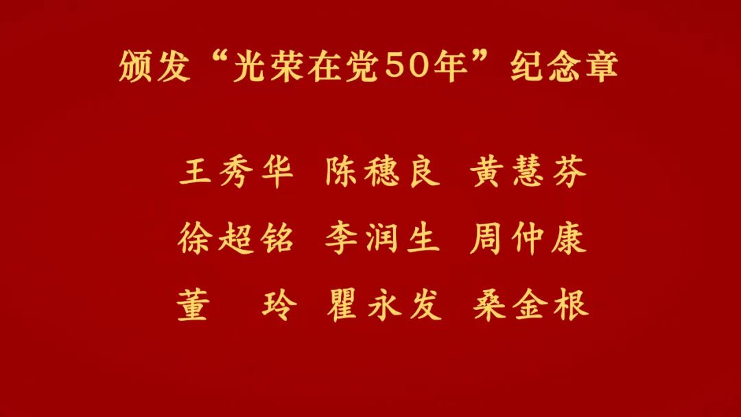 裴小倩为“光荣在党50年”老党员代表桑金根、董玲颁发纪念章,感谢他们为学校教育事业辛勤耕耘、无私奉献。