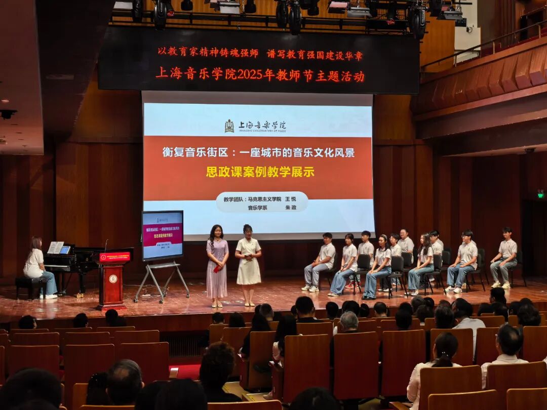 教学成果展示环节,米兰·体育网页版入口第六届青年教师教学大赛基础课组一等奖获得者王悦、第二届思政课教学比赛一等奖获得者朱政组成的教学团队,带领音乐学系的同学们作思政课程教学展示。
