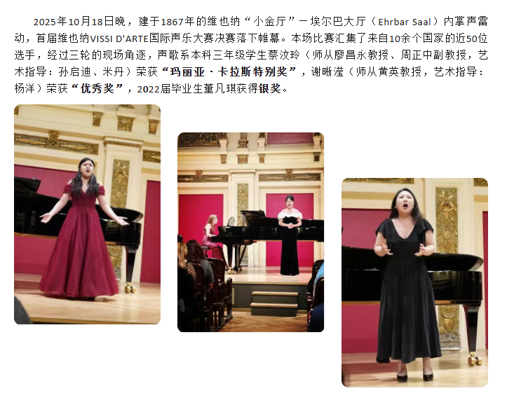 喜报 | 歌声回响·技艺共振——声歌系师生亮相维也纳VISSI D'ARTE艺术之光国际声乐大赛并斩获佳绩